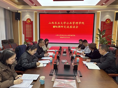 3月13日上午,调研组一行与山西大学政治与管理学院副院长冀慧珍、专业学位办公室主任梁振华、专业学位办公室副主任武照亮、MPA辅导员张超、石文杰老师以及教学秘书张涵淇举行座谈交流。冀慧珍副院长对调研组表示热烈欢迎,介绍了山西大学政治与管理学院的办学历史、学科建设和人才培养等基本情况。梁振华主任从搭建学科竞赛平台、增强研究生教育教学协作、提升双方合作水平等方面提出了工作思路和建议。双方还就研究生人才培养方案修订和课程建设、教学团队建设以及研究生科研工作进行了深入细致交流。调研组一行参观山西大学乡村振兴研究院,实地观摩了基地建设、学术发表、政策建议和科研项目等方面的成果。